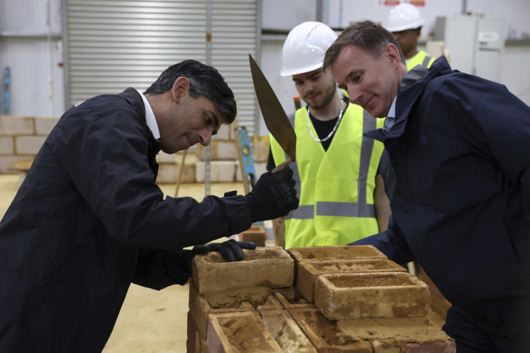 Britský premiér Rishi Sunak (vľavo) a britský minister financií Jeremy Hunt sa učia klásť tehly počas návštevy školy v Londýne. Foto: SITA/AP.