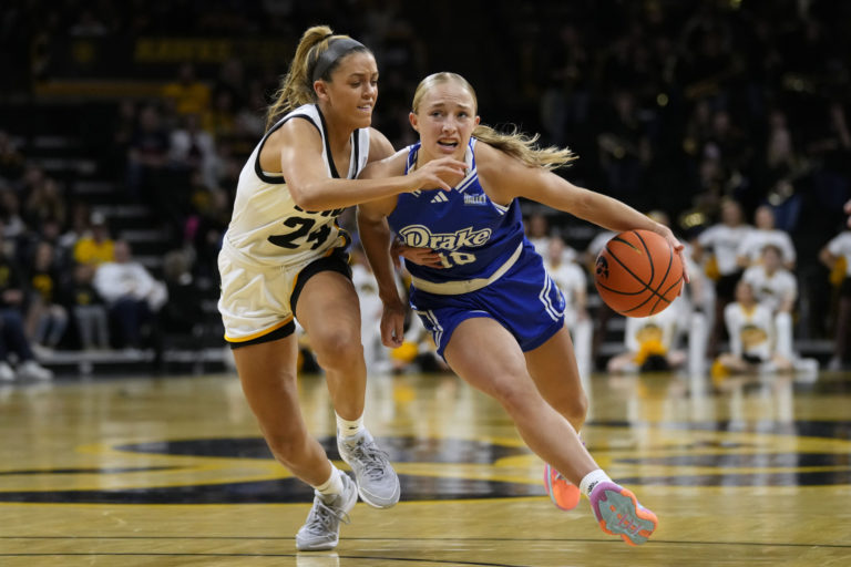 Basketbalistka Draku Katie Dinnebier sa snaží dostať ku košu cez hráčku Iowy Gabbie Marshall (24) počas prvého polčasu univerzitného basketbalového zápasu NCAA. Foto: SITA/AP.