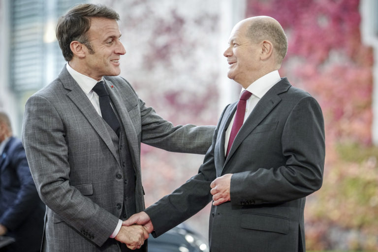 Nemecký kancelár Olaf Scholz (vpravo) víta francúzskeho prezidenta Emmanuela Macrona (vľavo) na investičnom summite G20 v Berlíne, ktorý sa týka spolupráce s africkými štátmi. Foto: Kay Nietfeld/dpa via AP.
