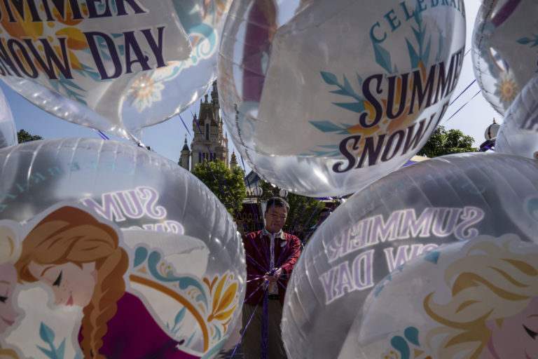 Zamestnanec Disneylandu drží balóny s tematikou rozprávky Frozen pred otváracím ceremoniálom v Hong Kongu. Foto: SITA/AP.