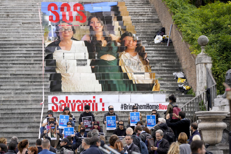 Členovia rímskej židovskej komunity sedia na schodoch Kapitolu v Ríme a žiadajú o oslobodenie rukojemníkov unesených 7. októbra Hamasom v Izraeli. Na obrovskom obrázku sú členovia unesenej rodiny Engelovcov. Foto: SITA/AP.