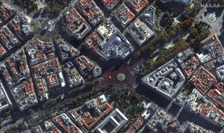 Letecký záber na protestujúcich proti amnestii v Madride. Foto: Satellite image ©2023 Maxar Technologies via AP.