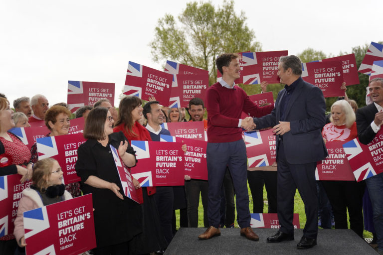 Líder Labouristickej strany Sir Keir Starmer gratuluje novozvolenému labouristickému poslancovi Alistairovi Strathernovi (vľavo), ktorý zvíťazil v doplňujúcich voľbách v Mid Bedfordshire v anglickom Bedforde. Foto: SITA/Joe Giddens/PA via AP