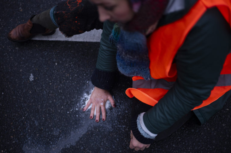 Aktivistka zo skupiny "Posledná generácia" si v Berlíne na protest proti politike týkajúcej sa zmeny klímy, prilepil ruku o asfalt. Foto: SITA/AP