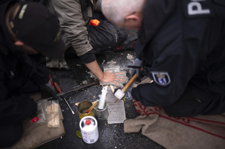 Aktivista zo skupiny "Posledná generácia" si v Berlíne na protest proti politike týkajúcej sa zmeny klímy, prilepil ruku o asfalt. Polícia mu ju musela odliepať za pomoci kladiva a dláta. Foto: SITA/AP