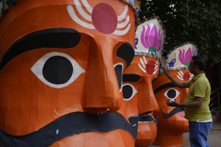 Umelec pripravuje podobizne desaťhlavého démona Boha Ravanu na nadchádzajúci festival Dussehra v Hyderabad v Indii.