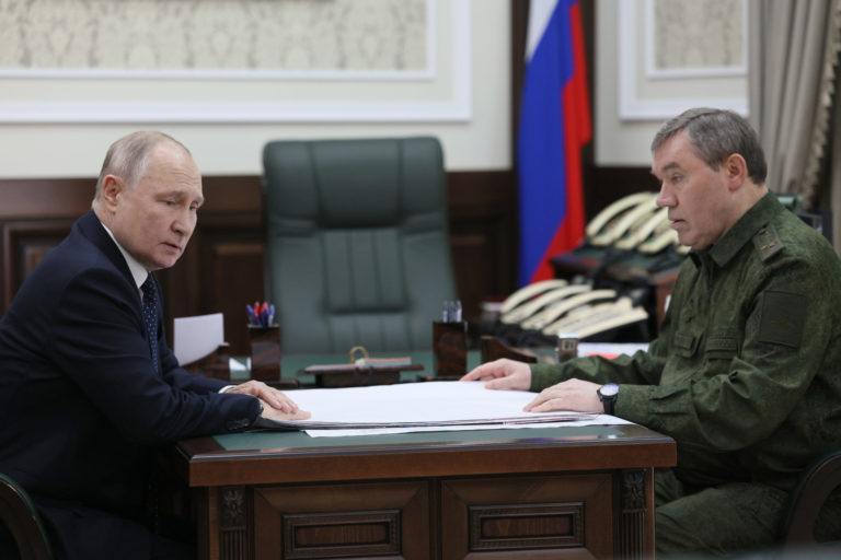 Ruský prezident Vladimir Putin a náčelník generálneho štábu gen. Valerij Gerasimov sa zhovárajú v sídle ruského južného vojenského okruhu v Rostove na Done. Foto: SITA/Gavriil Grigorov, Sputnik, Kremlin Pool Photo via AP)