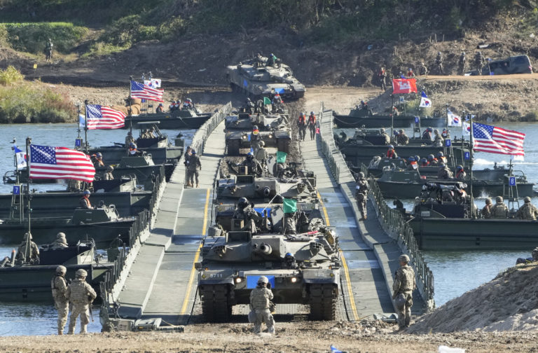 Tanky K1E1patriace juhokórejskej armáde prechádzajú cez plávajúci most na rieke Namhan. Išlo o spoločné cvičenie so Spojenými štátmi. Foto: SITA/AP