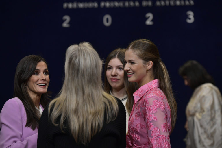 Americká herečka Meryl Streep sa rozpráva so španielskou kráľovnou Letiziou (vľavo) a jej dcérami princeznou Leonor (vpravo) a Sofiou po prevzatí emblému od španielskej kráľovskej rodiny počas odovzdávania cien princeznej z Astúrie v Oviede v severnom Španielsku. Foto: SITA/AP