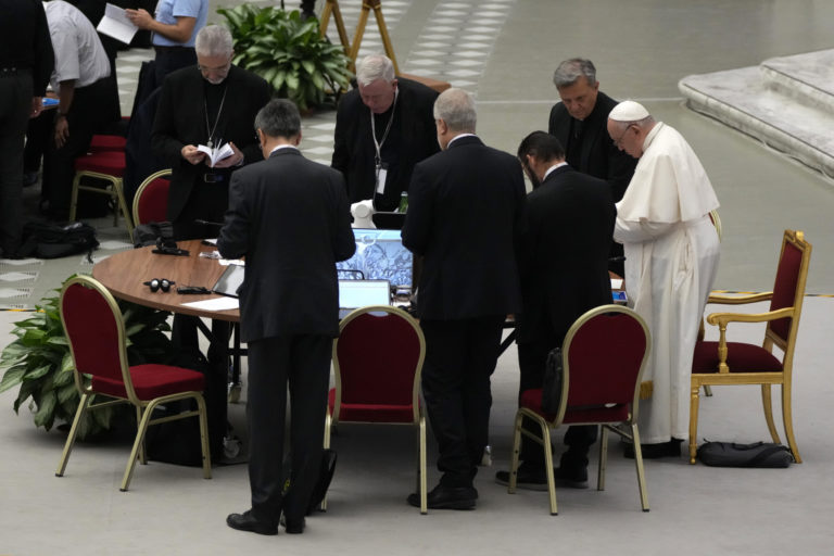 Pápež František sa modlí na začiatku zasadnutia 16. generálneho zhromaždenia biskupskej synody v Aule Pavla VI. vo Vatikáne. Foto: SITA/AP