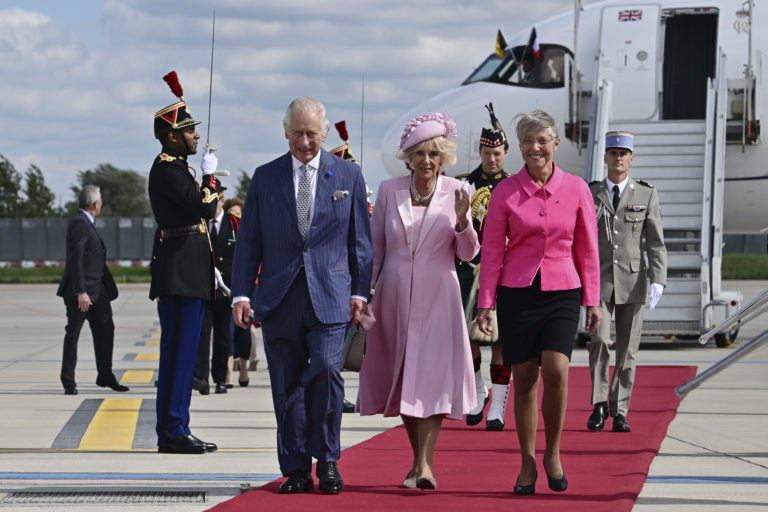 Britský kráľ Karol III. s manželkou Camillou po prílete do Paríža, kde ich vítala francúzska premiérka Elisabeth Borneová. Foto: Miguel Medina, Pool via AP.