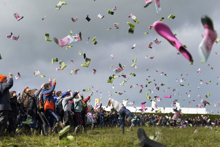 995 ľudí v írskej Ratheniske zúčastnilo pri pokuse prekonať Guinessov rekord v hádzaní gumákov. Foto: Niall Carson/PA via AP.