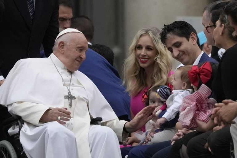 Pápež František pozdravuje veriacich a deti na Námestí sv. Petra vo Vatikáne. Foto: SITA/AP.