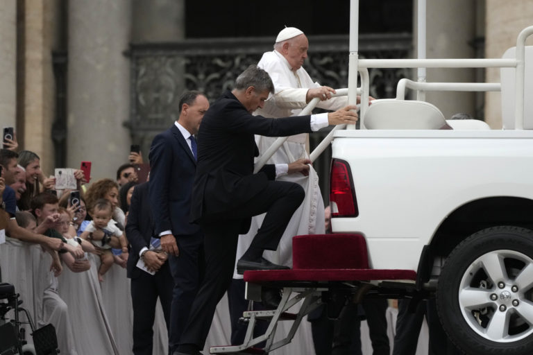 Pápež František nastupuje do auta na Námestí sv. Petra vo Vatikáne po svojej týždennej audiencie. Foto: SITA/AP.