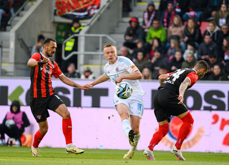 Nino Marcelli z ŠK Slovan Bratislava (uprostred) počas futbalového zápasu 6. kola nadstavbovej časti Niké ligy 2023/2024 medzi FC Spartak Trnava - ŠK Slovan Bratislava. Trnava, 21. apríl 2023. Foto: SITA/Martin Havran