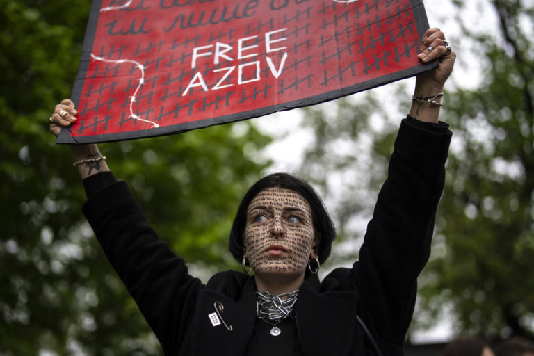 Demonštrantka počas zhromaždenia, ktorého cieľom je zvýšiť povedomie o osude ukrajinských vojnových zajatcov. Kyjev, 21. apríl 2024. Foto: SITA/AP