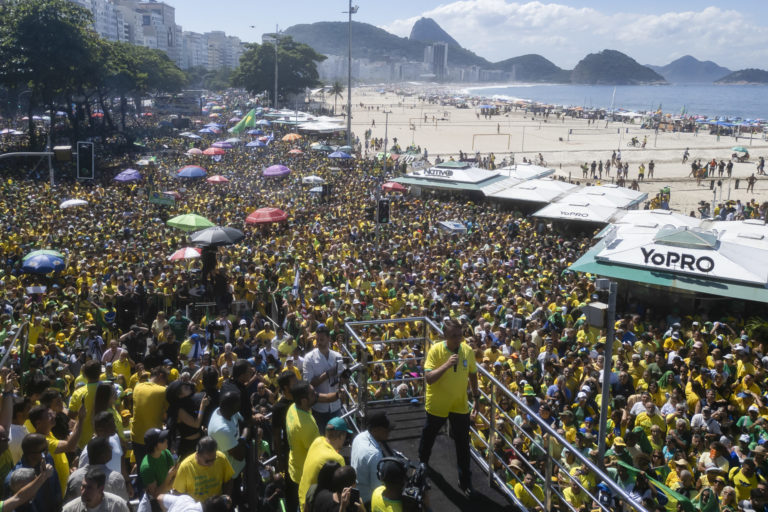 Bývalý brazílsky prezident Jair Bolsonaro hovorí počas demonštrácie volajúcej po slobode prejavu na pláži Copacabana. Rio de Janeiro, 21. apríl 2024. Foto: SITA/AP