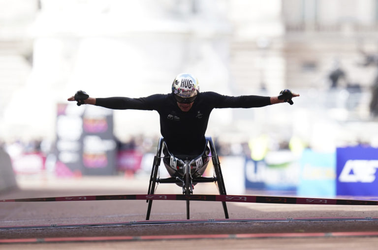 Víťazný Švajčiar Marcel Hug v cieli pretekov vozíčkarov na Londýnskom maratóne. Londýn, 21. apríl 2024. Foto: John Walton/PA via AP
