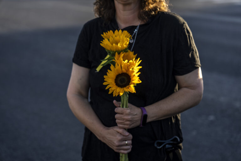 Žena so slnečnicami počas zhromaždenia príbuzných a podporovateľov rukojemníkov zadržiavaných v pásme Gazy militantnou skupinou Hamas vyzývajúcich na ich prepustenie. Kfar Saba, 21. apríl 2024. Foto: SITA/AP