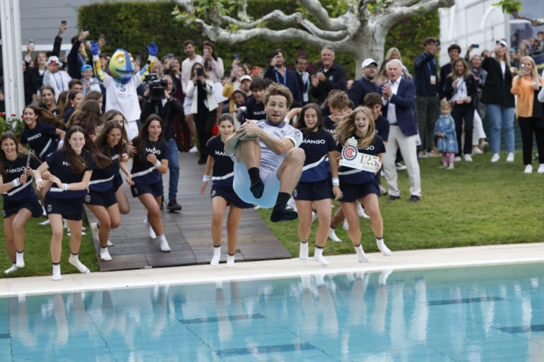 Nórsky tenista Casper Ruud skáče do bazéna počas oslavy svojho víťazstva na turnaji Barcelona Open. Barcelona, 21. apríl 2024. Foto: SITA/AP
