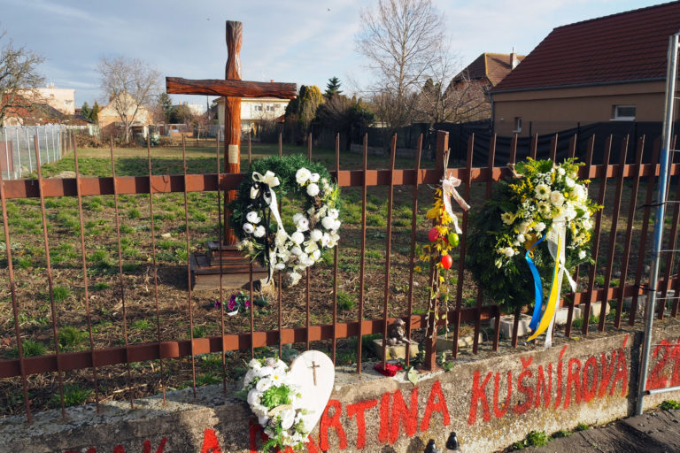 Pamiatka zavraždeného novinára Jána Kuciaka a jeho snúbenice Martiny Kušnírovej na mieste tragickej udalosti vo Veľkej Mači v okrese Galanta. Foto: SITA/Pavol Machovič.