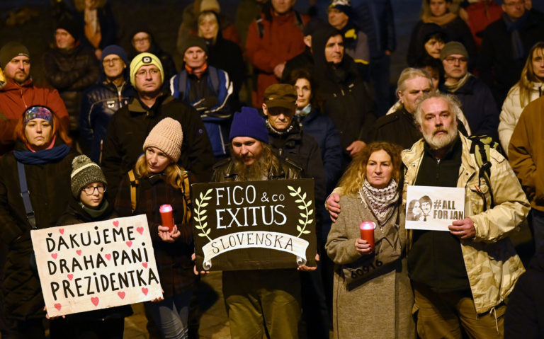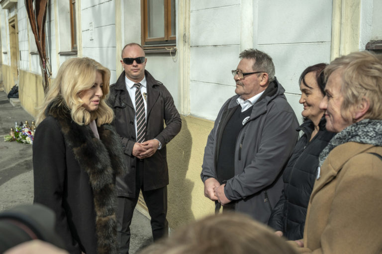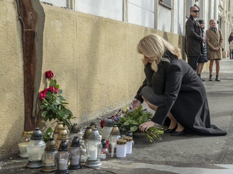 Prezidentka Zuzana Čaputová (v popredí) počas uctenia si pamiatky Jána Kuciaka a jeho snúbenice Martiny Kušnírovej položením kytice a zapálením sviečky pri pamätníku na Námestí SNP v Bratislave pri príležitosti 6 rokov od ich vraždy. Foto: SITA/Milan Illík.
