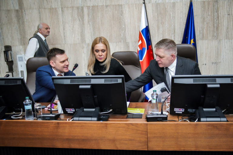 Zľava: Minister životného prostredia SR Tomáš Taraba, podpredsedníčka vlády a ministerka hospodárstva SR Denisa Saková a preedseda vlády SR Robert FIco počas rokovania 17. schôdze vlády SR. Foto: SITA/Úrad vlády SR.