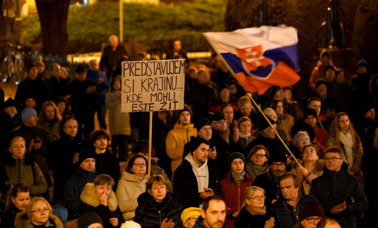 Zľava: Rodiča zavraždeného Jána Kuciaka otec Jozef Kuciak a matka Jana Kuciaková, matka zavraždenej Martiny Kušnírovej Zlatica Kušnírová počas zhromaždenia iniciatívy Za slušné Slovensko pod názvom 6 rokov bez Jána a Martiny na Námestí slobody v Bratislave. Foto: SITA.