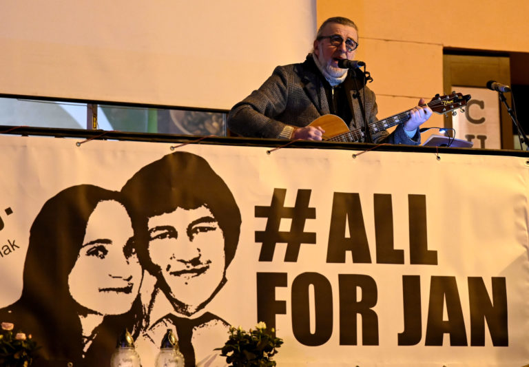 Prešovský pesničkár Edo Klena počas vystúpenia v rámci spomienky na šieste výročie vraždy novinára Jána Kuciaka a jeho snúbenice Martiny Kušnírovej organizovanej iniciatívou Za slušné Slovensko na Hlavnej ulici v Prešove. Foto: SITA/Viktor Zamborský.