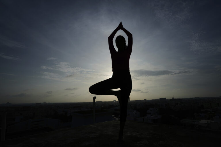 A girl performs yoga on the roof of an apartment on International Day of Yoga in Hyderabad, India, Saturday, June 21, 2025. (AP Photo/Mahesh Kumar A.)