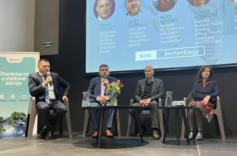 Zľava: Podpredseda vlády SR a minister životného prostredia SR Tomáš Taraba, predseda Združenia miest a obcí Slovenska (ZMOS) Jozef Božik, prezident Asociácie podnikateľov v odpadovom hospodárstve (APOH) Peter Krasnec a docentka Fakulty baníctva, ekológie, riadenia procesov a geotechnológií Technickej univerzity v Košiciach (TUKE) počas Medzinárodnej konferencie Jesenná Itapa 2023. Foto: SITA/Kristína Valovičová.
