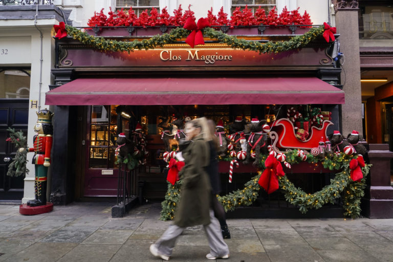 Vianočné ozdoby pred reštauráciou v oblasti Covent Garden v Londýne. Foto: SITA/AP.