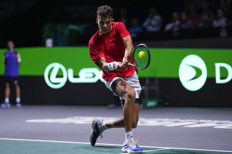 Kanadský tenista Gabriel Diallo počas zápasu proti Fínovi Ottovi Virtanenovi vo štvrťfinále Davis Cupu v španielskej Malage. Foto: SITA/AP.