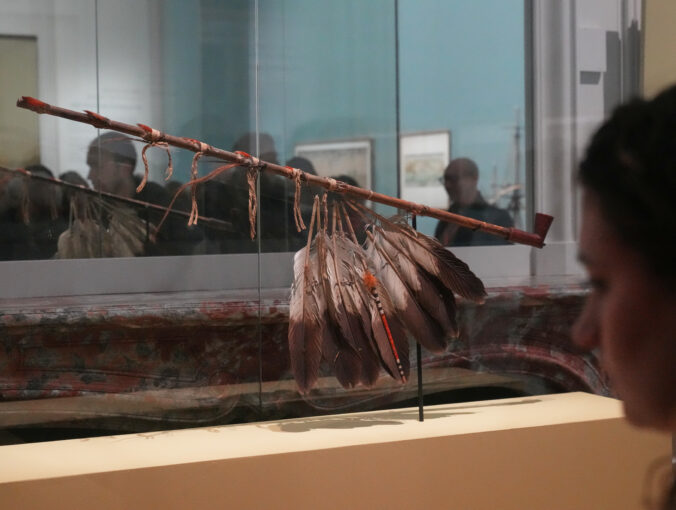 Návštevník sa pozerá na fajku mieru, Veľké jazerá alebo údolie Mississippi, 17. storočie, počas výstavy „1725. Spojenci pôvodných obyvateľov Ameriky na dvore Ľudovíta XV.“ pri príležitosti 300. výročia koalície z koloniálnej éry proti Angličanom v paláci Versailles západne od Paríža. Francúzsko, 21. novembra 2025. Foto: AP Photo/Michel Euler