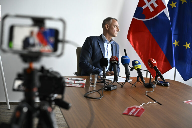 Minister investícií, regionálneho rozvoja a informatizácie SR Richard Raši počas tlačovej besedy v zasadacej miestnosti ministra v budove Tower 115, v ktorej sídli Ministerstvo investícií, regionálneho rozvoja a informatizácie (MIRRI) SR na tému: Predražený nábytok, ktorý nakúpila pani Remišová. Bratislava, 21. november 2024. Foto: SITA/Milan Illík