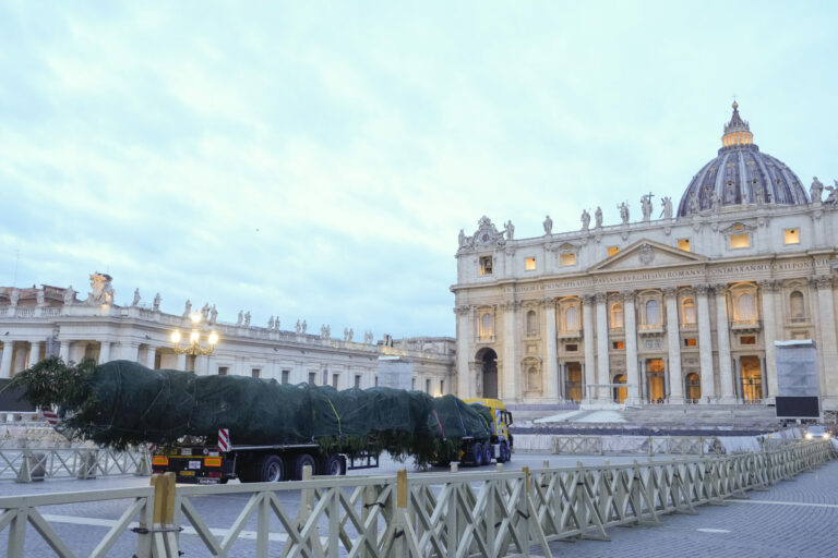 Nákladné auto s 29-metrovou červenou jedľou prichádza na Námestie sv. Petra z dediny Ledro v Dolomitoch, aby ho ozdobili a rozsvietili ako vianočný stromček. Vatikán, 21. november 2024. Foto: SITA/AP