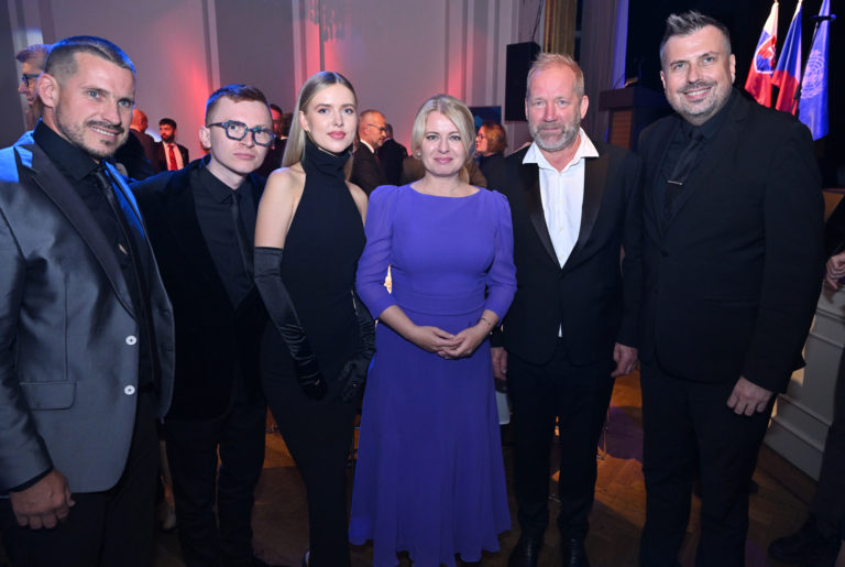 Prezidentka SR Zuzana Čaputová (uprostred) počas Česko-slovenského galavečera v New Yorku, kde na hostí čakal bohatý kultúrny program. O ten sa postarali Martin Valihora, Kristína Mihaľová, David Koller a Karel Ružička. Foto: www.facebook.com
