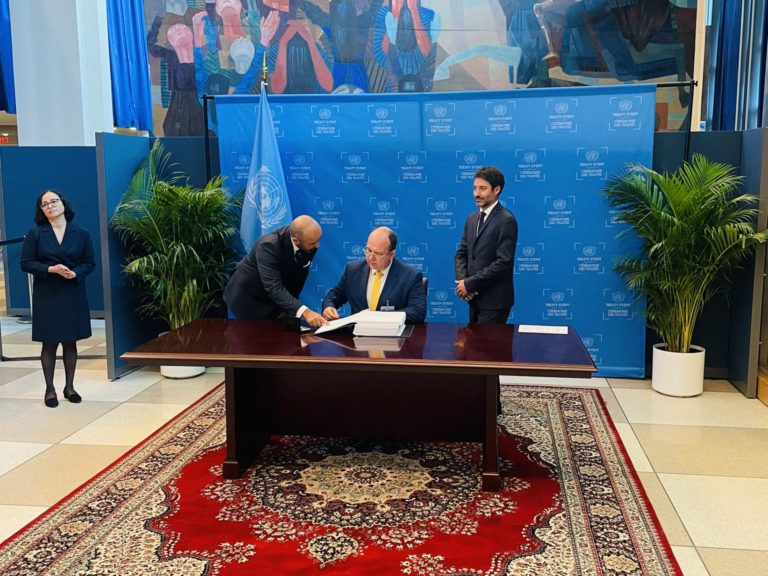 Minister zahraničných vecí Miroslav Wlachovský (druhý sprava) podpísal dohodu v rámci Dohovoru Organizácie Spojených národov (OSN) o morskom práve o ochrane a udržateľnom využívaní morskej biodiverzity v oblastiach mimo vnútroštátnej právomoci. New York, 21. september 2023. Foto: SITA/MZVaEZ SR.