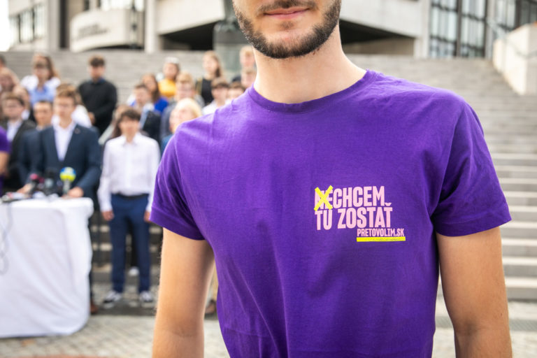 Brífing Aliancie stredoškolákov a OZ Krupica pred budovou NR SR na Námestí A. Dubčeka na tému - Predčasné parlamentné voľby či predstavenie dokumentu Stredné školstvo očami politikov. Bratislava, 21. september 2023. Foto: SITA/Diana Černak.