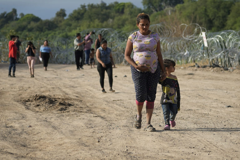 Migranti, ktorí prešli z Mexika, sa prechádzajú okolo drôtu lemujúceho brehy rieky Rio Grande v Texase. Foto: SITA/AP.
