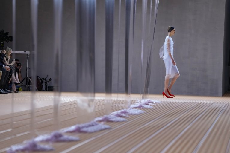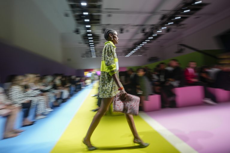 Modelka má na sebe model v rámci dámskej kolekcie Benetton jar/leto 2024, ktorý bol predstavený počas módnej prehliadky v Miláne. Foto: SITA/AP.