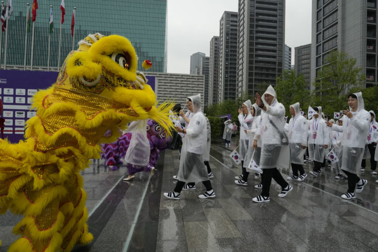 Športovci a predstavitelia tímov z Južnej Kórey prechádzajú okolo dračieho tanečného vystúpenia počas slávnostného privítania športovcov na 19. ázijských hrách v Chang-čou v Číne. Foto: SITA/AP.