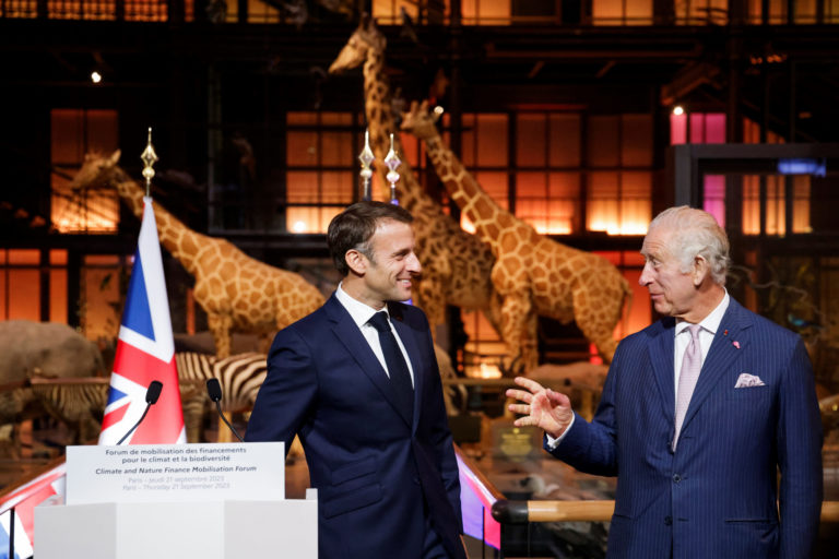 Francúzsky prezident Emmanuel Macron (vľavo) sa rozpráva s britským kráľom Karolom III. počas ich návštevy National History Museum v Paríži. Foto: Ludovic Marin, Pool via AP.