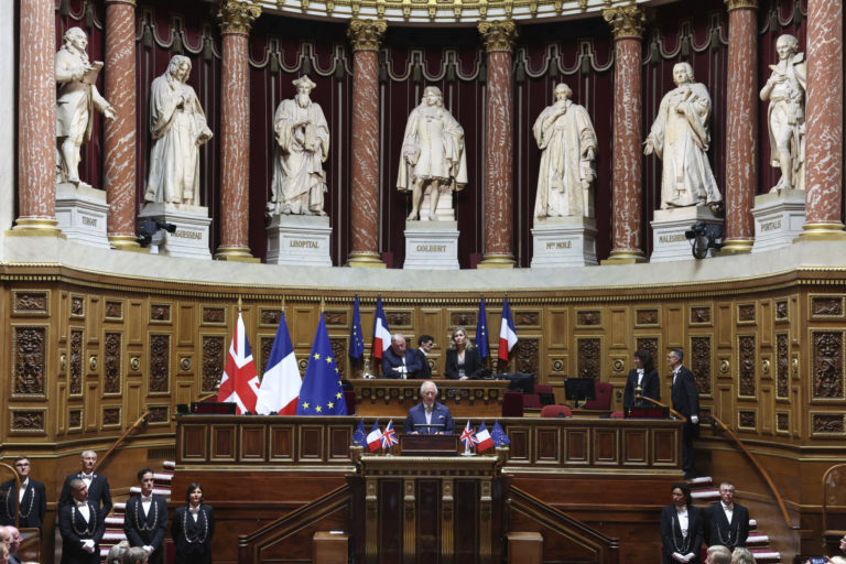 Britský kráľ Karol III. počas svojho prejavu pred zákonodárcami hornej aj dolnej komory parlamentu v Paríži, kde je na štátnej návšteve. Foto: Emmanuel Dunand, Pool via AP.