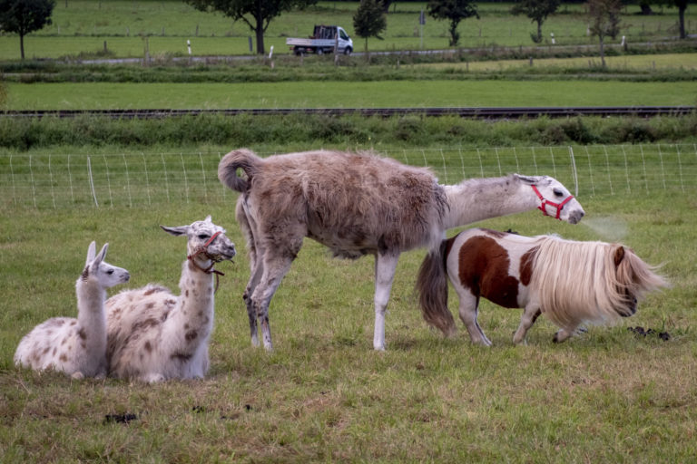 Láma pľuje na shetlandského poníka na lúke vo Wehrheime pri Frankfurte v Nemecku. Foto: SITA/AP.