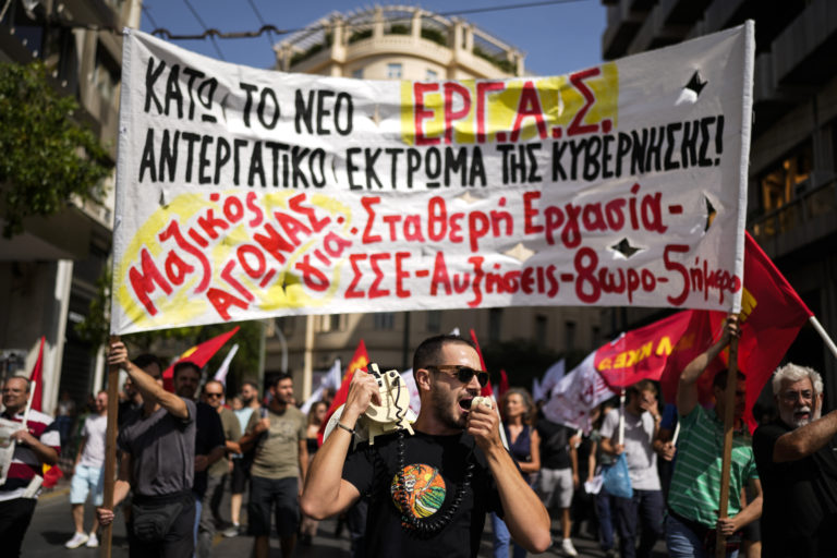 Muž kričí do ampliónu počas 24-hodinového štrajku v Aténach, kedy grécke odborové zväzy štátnych zamestnancov protestujú proti navrhovaným zmenám pracovného práva. Foto: SITA/AP.