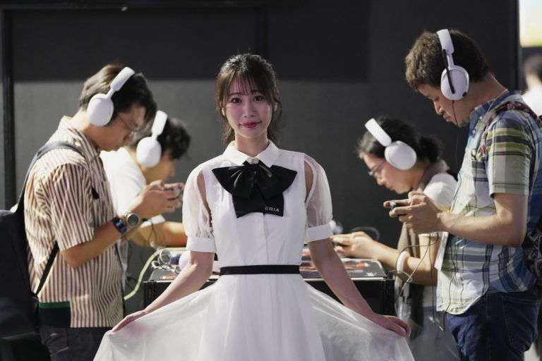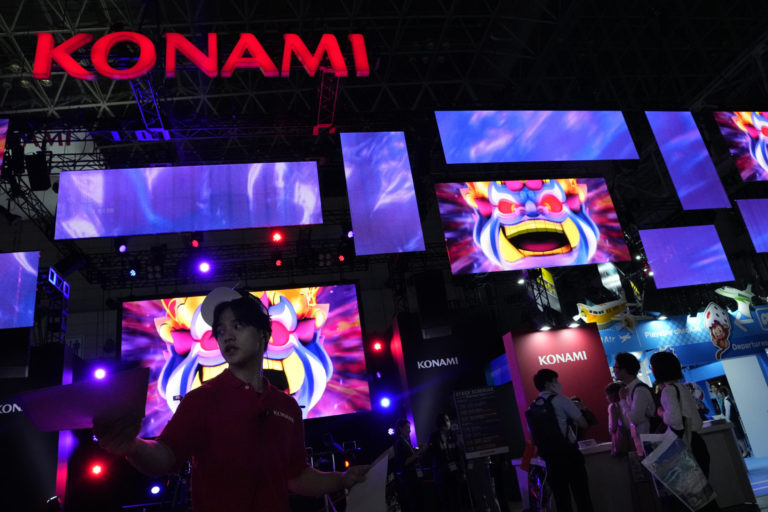 Zamestnanec rozdáva letáky v stánku Konami v prvý deň Game Show v kongresovom centre Makuhari Messe v Tokyu. Foto: SITA/AP.