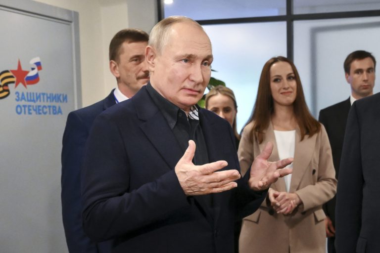 Ruský prezident Vladimir Putin mal prejav počas návštevy centra Vozvraščenje, pobočky štátneho fondu Obrancovia vlasti na podporu účastníkov špeciálnej vojenskej operácie vo Veľkom Novgorode v Rusku. Foto: Ilya Pitalev, Sputnik, Kremlin Pool Photo via AP.