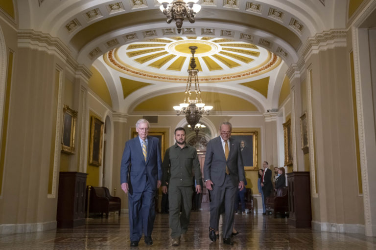 Ukrjainský prezident Volodymyr Zelenskyj (uprostred) kráča so senátormi Mitchom McConnellom (vľavo) a Chuckom Schumerom (vpravo) počas svojej návštevy New Yorku. Foto: SITA/AP.