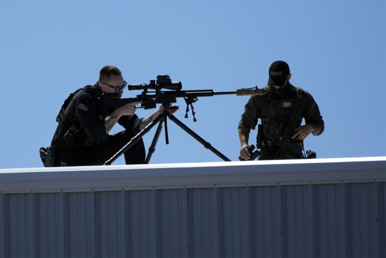 Členovia federálnych a miestnych orgánov činných v trestnom konaní na streche pred prejavom republikánskeho prezidentského kandidáta, bývalého prezidenta Donalda Trumpa. Foto: SITA/AP